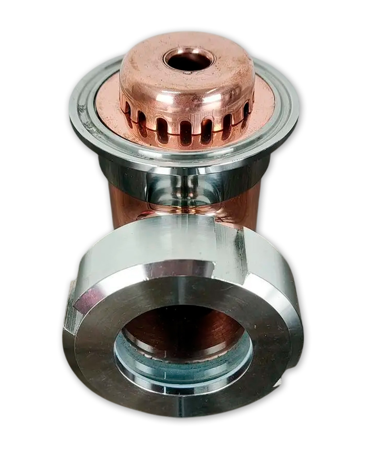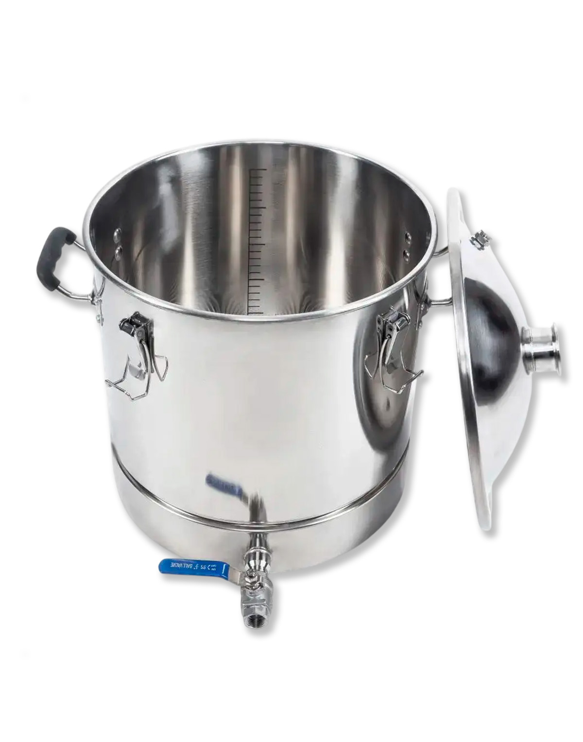 1) 40 litru destilācijas kubs (tvertne) ar kupola vāku 2″ clamp-savienojumam, pārtikai paredzēts nerūsējošais tērauds AISI 304;